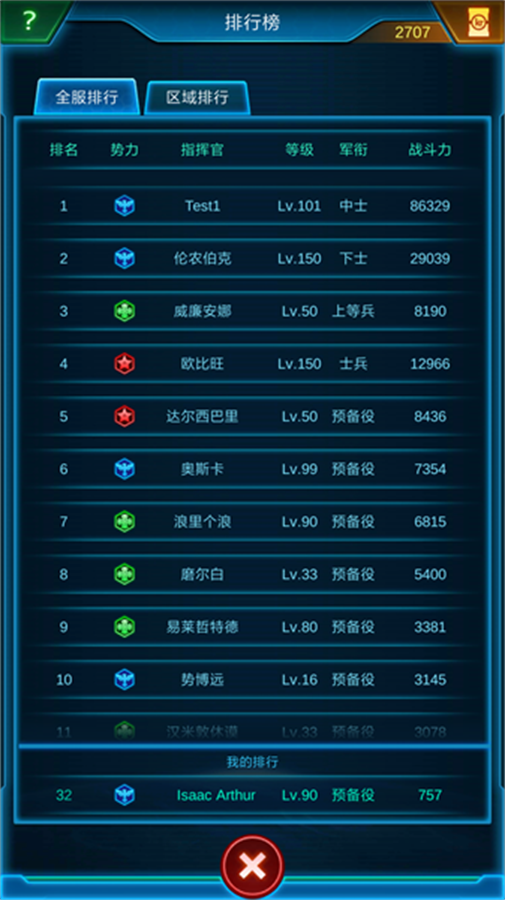 指挥官可以通过主界面上的排行榜按钮进入到综合排行榜,查看自己的综合实力在当前服务器中所处的位置,点击区域按钮也可查看您当前在该区域中的排行。