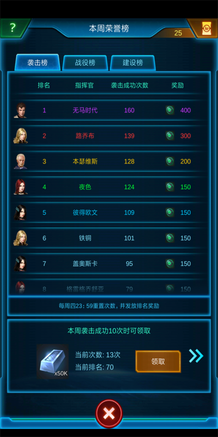 在势力界面中,有一个每周荣誉榜,指挥官们进行基地战,星球战,捐献的次数都会统计到势力荣誉榜上,每周四结束结算一次,指挥官在结算后可获得对应数量的荣誉币。另外达到一定要求还可领取额外的资源奖励。