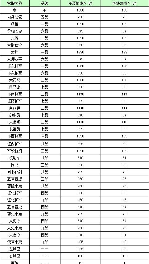 下面是皇城官职的品阶、资源加成一览表。