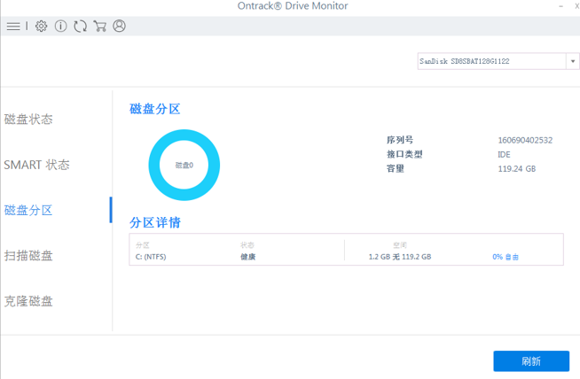 第四步:点击“磁盘分区”。磁盘分区页面会显示磁盘各分区的储存空间和健康状态。