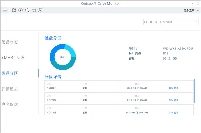 监控硬盘这样的功能可不是每个数据恢复软件都具备的,在EasyRecovery中,监控硬盘分为5项,分别是磁盘状态、SMART状态、磁盘分区、扫描磁盘和克隆磁盘,通过这几项检测可以判断磁盘健康状态,因此来决定是否需要对数据做备份。