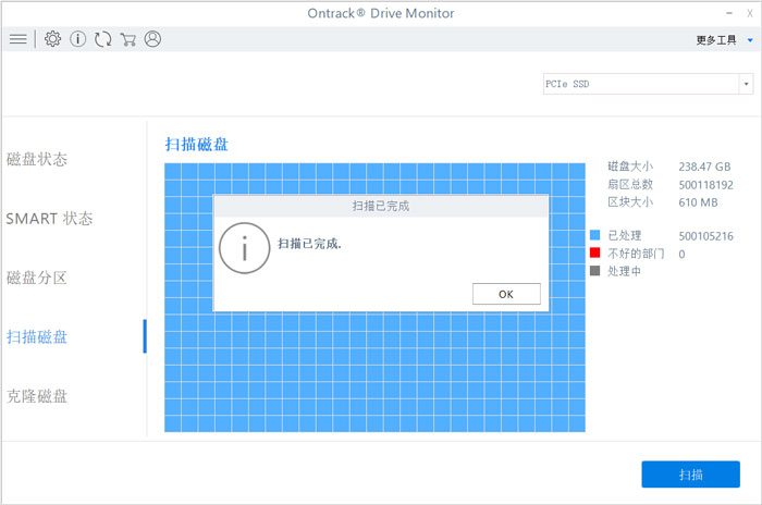第五步:点击“扫描磁盘”。扫描磁盘可以查看磁盘中是否有坏道以及坏道分布。扫描区域显示蓝色方块则表示硬盘健康,出现红色方块则表示硬盘出现坏道。需要注意的是,当硬盘的坏道超过30%时,就应该停止使用。