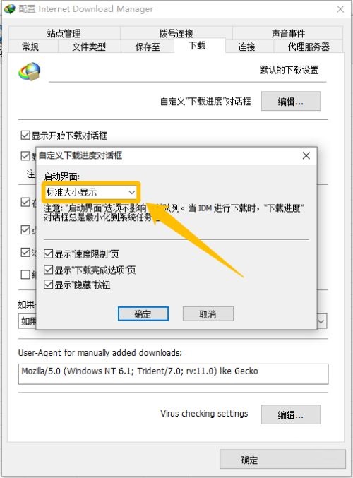 第五步:在弹出来的“自定义下载进度对话框”中,点击“启动界面”中的复选框(如图所示)。