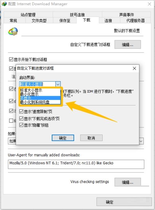 第七步:最后在展开的下拉框中选择“不显示”选项后,点击下方的“确定”按钮,这样就可以成功设置不显示下载进度对话框的启动画面了(如图所示)。
