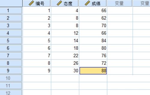 第二步:然后我们在数据视图输入相关的数据,编号对应的态度和测验成绩(如图所示)。