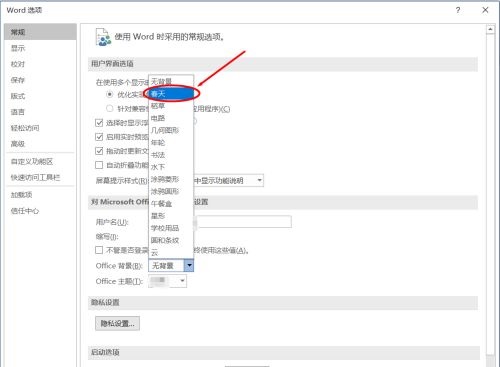 第四步:弹出“选项”设置对话框,选择“常规”,选择“office背景”(如图所示)。