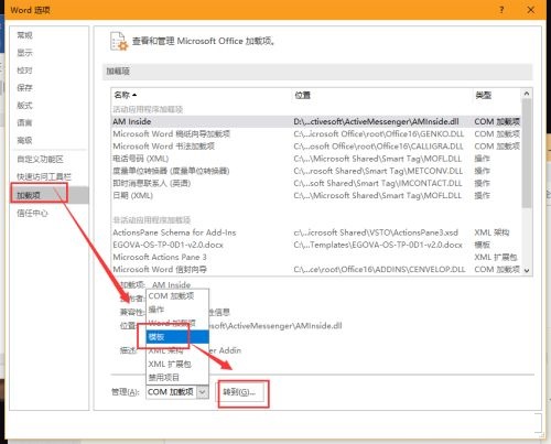 第三步:在弹出的页面点击加载项,选择管理中的模板后,点击转到(如图所示)。