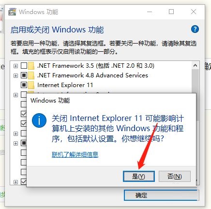 第六步:点击Internet Explorer 11前面复选框的√,这样会有个提示,点击是(如图所示)。