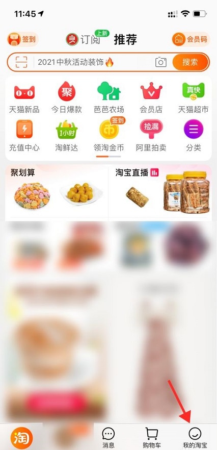 第一步:打开淘宝,进入首页,点击右下角的我的淘宝(如图所示)。