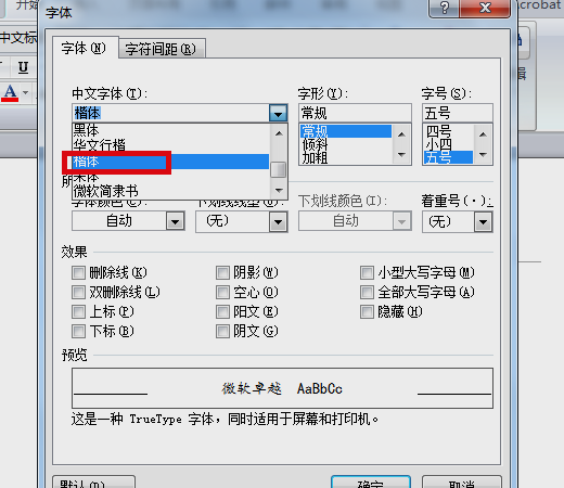 第二步:在出现的字体设置界面,将中文字体设置为“楷体”(如图所示)。