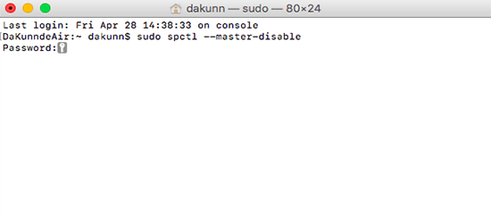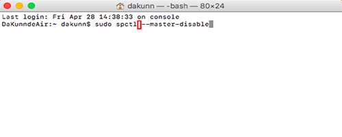 然后,输入代码:sudo spctl --master-disable(*master前面为两个短横线)注意红框处是空格。