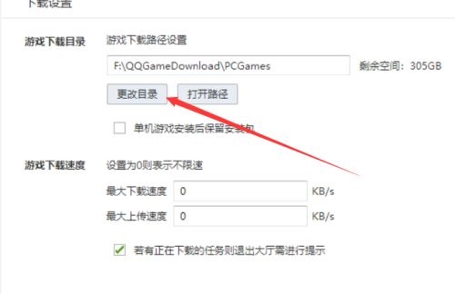 第五步:然后在右侧找到“游戏下载目录”选项栏,然后在其下方选择“更改目录”(如图所示);