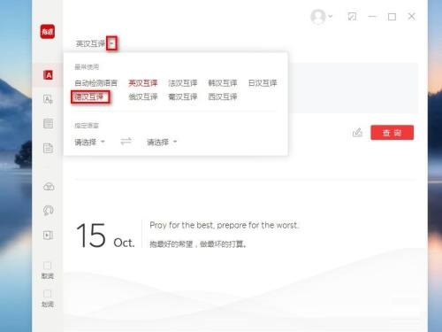 第一步:打开有道词典,点击左上的倒三角图标,图中红圈处(如图所示)。