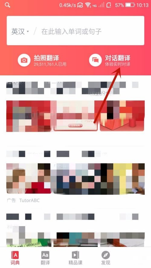 第二步:进入有道词典首页之后点击一下上面的“对话翻译”(如图所示)。