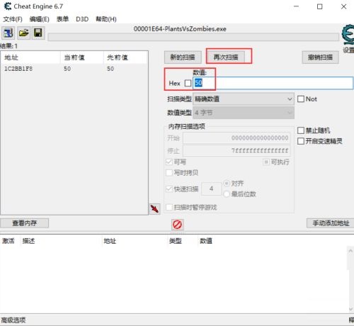 第五步:ait+tab再切换到ce修改器。把数值改成50点击再次搜索。就剩下一条结果了(如图所示)。