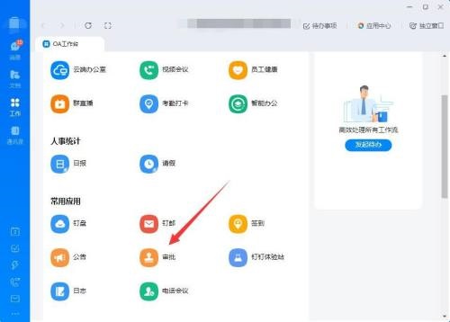 第二步:进入到工作台后,在工作台中点击审批的功能按钮(如图所示)。