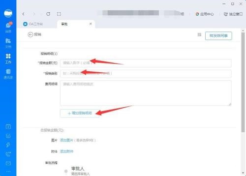 第五步:填写报销的材料证明,然后添加审批人金额,直接点击报销(如图所示)。