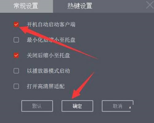 第四步:在“设置”弹窗中的“常规设置”版面中,选中【开机自动启动客户端】选项,单击【确定】完成(如图所示)。