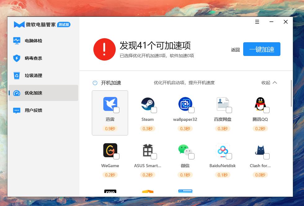 除了病毒杀毒这个最主要的功能,其他电脑管家该有的功能,它也是一个不缺:电脑体检、垃圾清理、优化加速都安排上了,只不过这些功能都比较普通,下面我们一个个来聊。