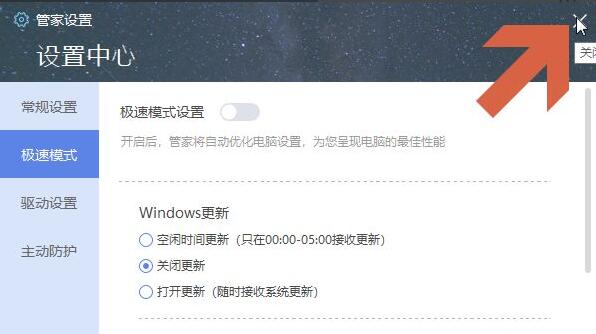 点击选择极速模式选项卡中的【关闭更新】选项。