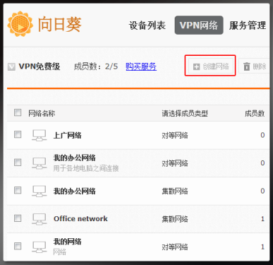 客户端配置成功后,使用向日葵帐号和密码登录向日葵官网,在VPN网络中点击创建网络进行网络组建。