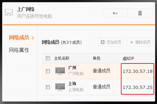 搭建完成后,系统会自动给每一个在此虚拟网络里面的电脑分配一个虚拟IP地址(以172开头)。以后这些虚拟网络之间通讯就依靠这个虚拟IP来完成。注意一点,这些虚拟IP是系统自动分配的,用户不可能手动更改。