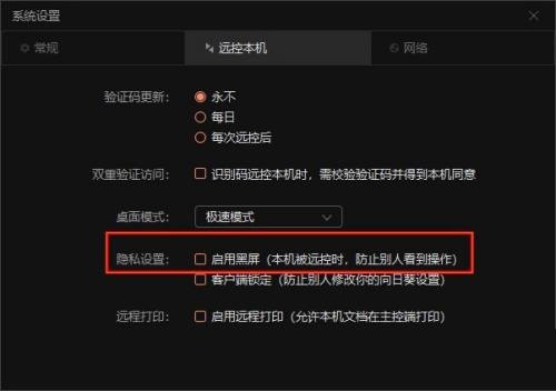 第五步:切换到"控制本机"菜单栏,找到"隐私设置"项,默认情况下,"启用黑屏"选项是"禁用"状态的。