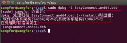 首先,点击安装包,显示安装成功,但在搜索栏输入EasyConnect,却搜索不到时,可通过命令行终端(Terminal)执行命令来安装,如下图所示: