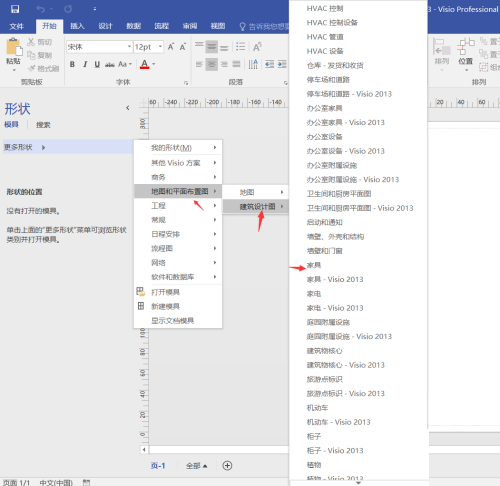 第五步:接下来我们就可以利用Visio左边栏的“家具图”形状图以及工具栏中的工具进行绘制家具图了。如下图: