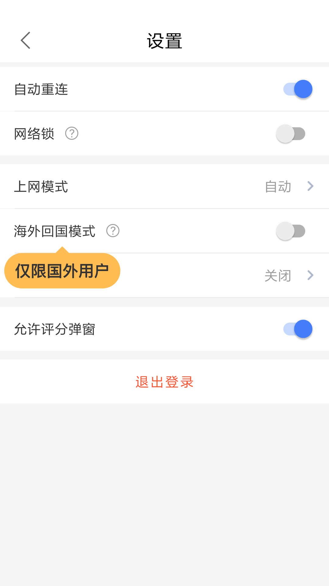第八步:账号设置可选择是否开启“海外回国模式”(仅限国外用户)与“指定应用”功能,“账号与安全”可绑定邮箱、修改密码。
