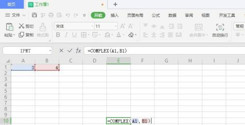 第六步:在单元格E10中,输入"=COMPLEX(A1,B1)"内容,即表示将A1和B1单元格中所对应的实部和虚部转换成一个复数。