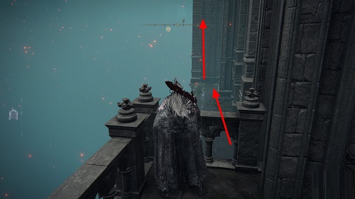 来到广场角落跳至下方的平台,随后通过前面的梯子向上。