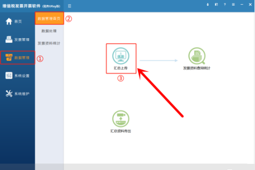 第一步:打开增值税发票开票软件税务UKey版,进入数据管理,点击数据管理首页,选择汇总上传。