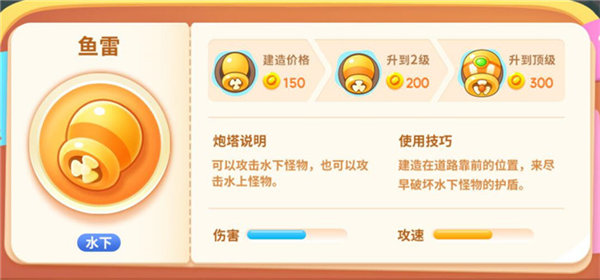 炮塔说明:可以攻击水下怪物,也可以攻击水上怪物。建造价格:150金币,升到2级200金币,升到顶级300金币。