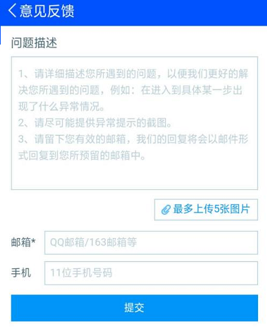 第五步:最后填写邮箱和手机号码就可以反馈意见,如下图所示。