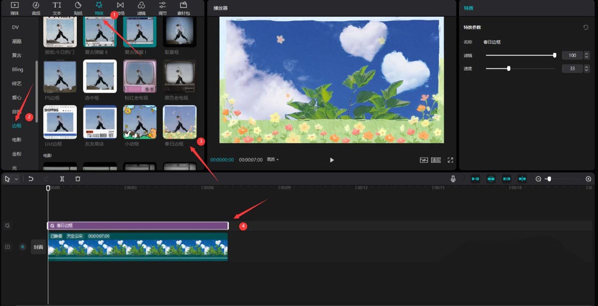 第三步:点击特效按钮,选择边框中的春日边框特效,将其添加到特效轨道中,见下图。