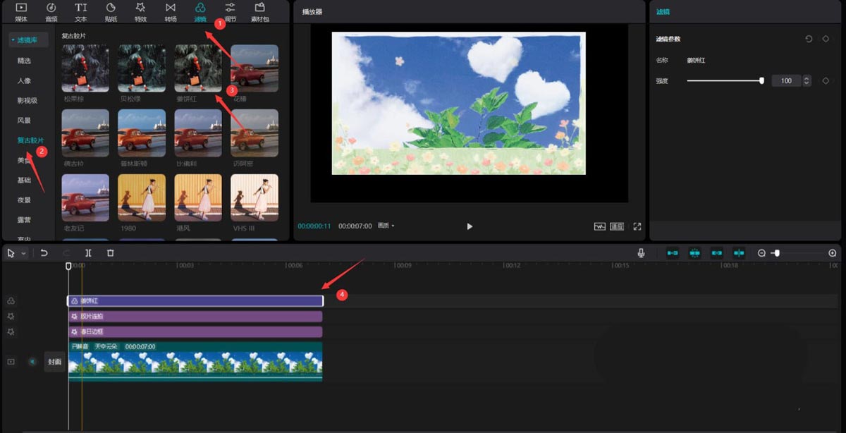 第五步:点击滤镜按钮,选择复古胶片中的姜饼红滤镜,将其添加到滤镜轨道中,见下图。