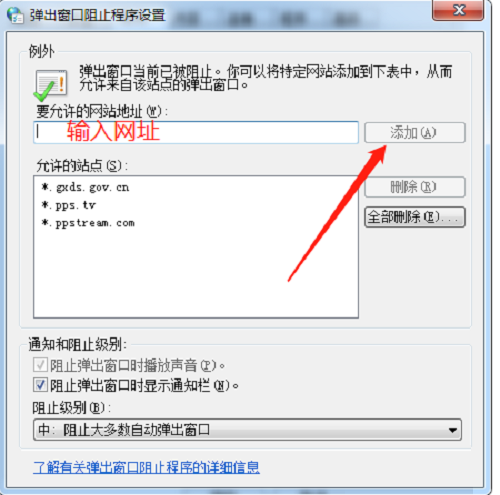第五步:在弹出的对话框中,输入要允许的网站地址,点击【添加】即可。