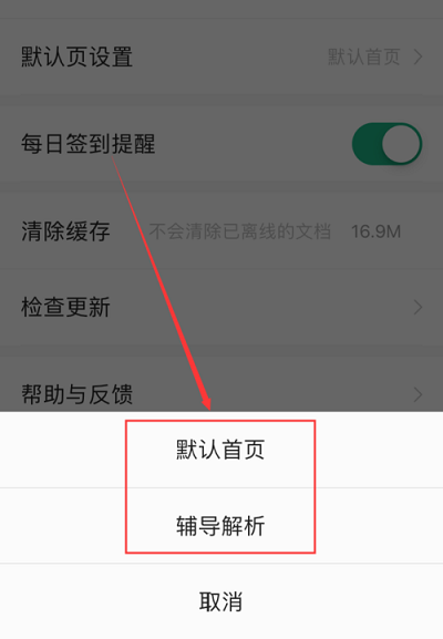 第五步:在弹窗中选择软件打开的默认页,如默认首页、辅导解析。