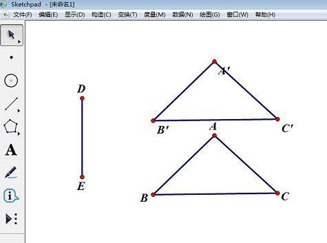 第一步:新建一个几何画板文件。绘制出一个三角形ABC,并在三角形外任意绘制一条垂直的线段DE。