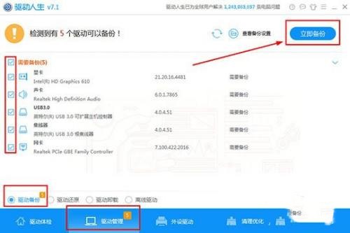在下方的栏目中点击选择进入到驱动管理的栏目界面,接着直接点击左下角的“驱动备份”功能选项,在驱动备份界面之中,直接选择想要备份的驱动,基本上只需全选即可,接着点击“立即备份”选项开始备份吧!如下图所示: