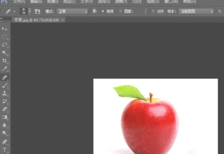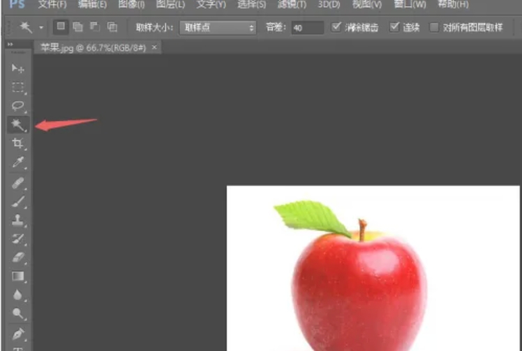 1.打开Photoshop CS6,打开一张图片,以抠苹果图片为例,在左边菜单栏点击【魔棒工具】