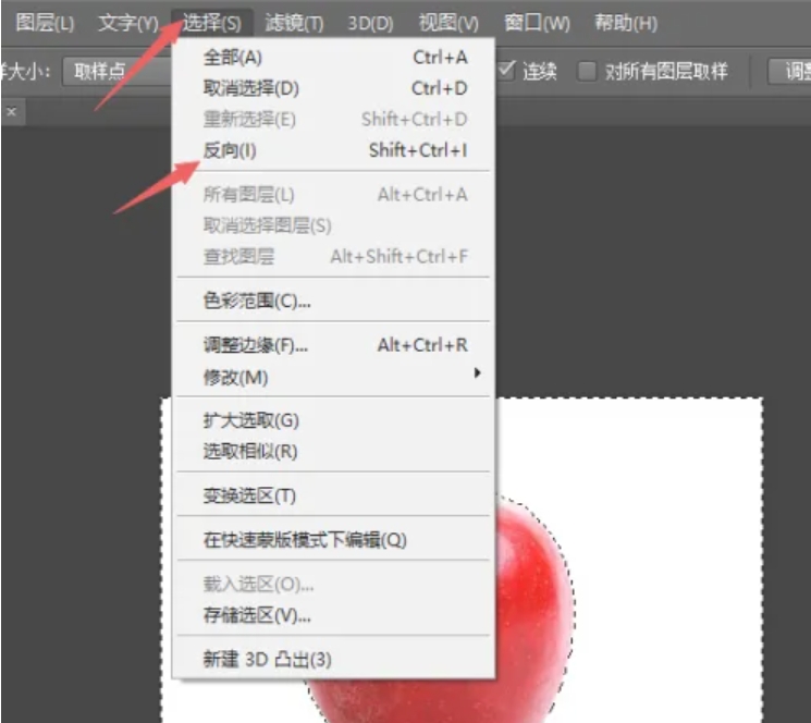 3.在最上面菜单栏点击【选择】选项,再点击【反向】功能