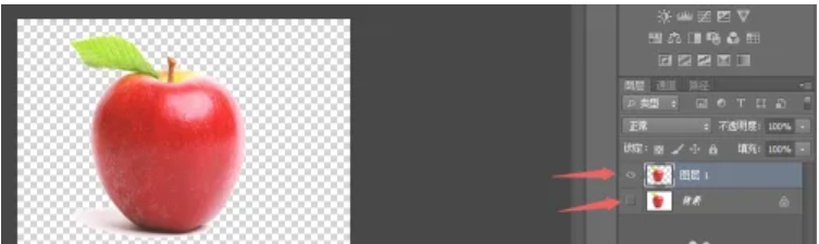 6.然后可以看见最右边的图层栏出现了一个【图层1】的图层,该图层就是我们抠出来的苹果图层,点击【背景】图层前面的眼睛将其隐藏,我们就可以对【图层1】进行修改操作。