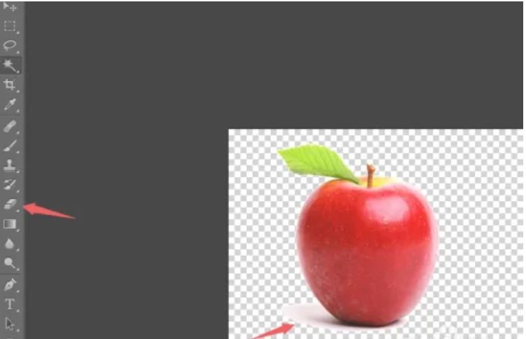 7.我们看见苹果的左下角抠图选择得不是很好,需要将其修改,所以点击左边菜单栏中的【橡皮擦工具】,将其慢慢擦除即可
