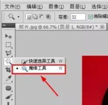 1、点击左栏「魔棒工具」,在照片的红色底色那里点击一下,会出现“虚线选区”。