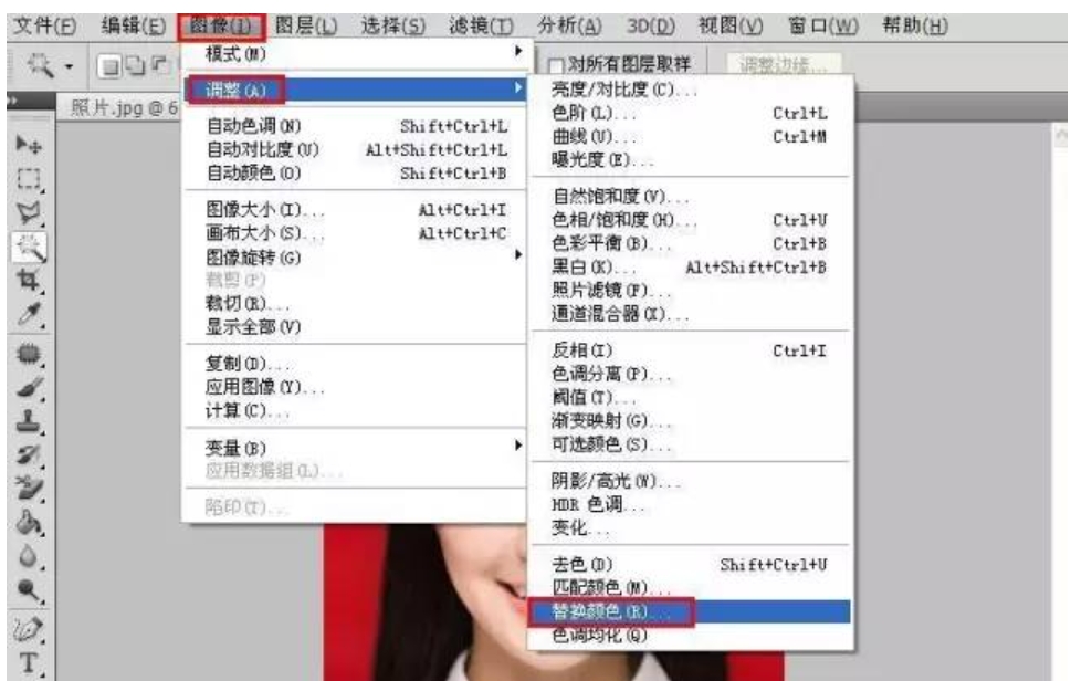1、在上方工具栏点击“图像—调整—替换颜色”,鼠标会变成一个吸管,用吸管在照片的红色底色上任意一个地方点一下,容差选最大值“200”。