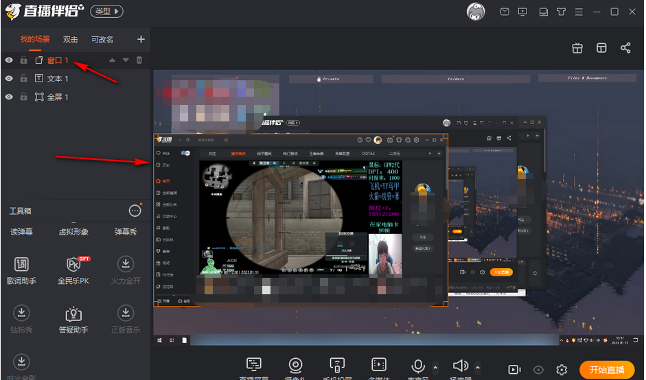 6、第六步,添加直播内容之后,“我的场景”页面中就会出现“窗口1”选项,我们将原本的教程页面删除或隐藏,然后在页面中看到带有黄色边框的内容就是观众能看到的区域