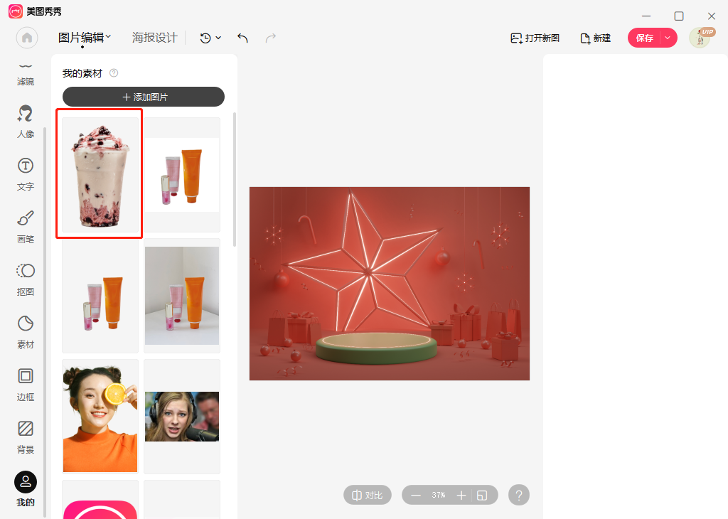 2、选择要添加的素材图进行智能抠图,然后点右上角保存旁箭头里的【保存到我的素材】