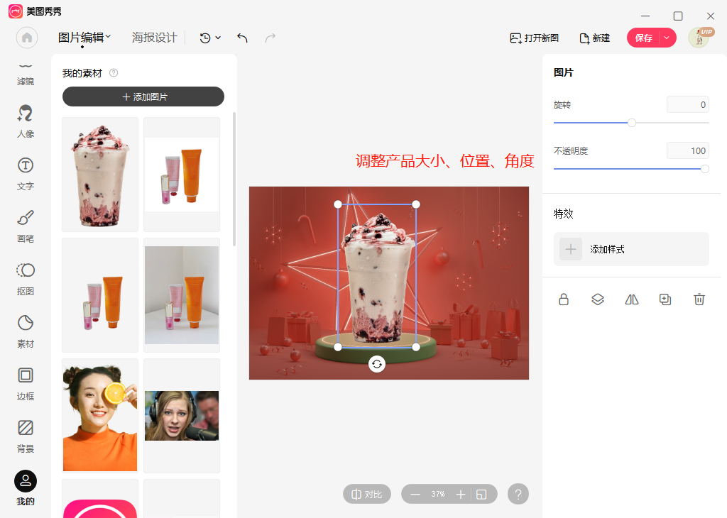 4、直接拉边框调整产品的大小位置角度,点击右上角下载即可,这张图就做好保存在了你电脑文件夹中哦。